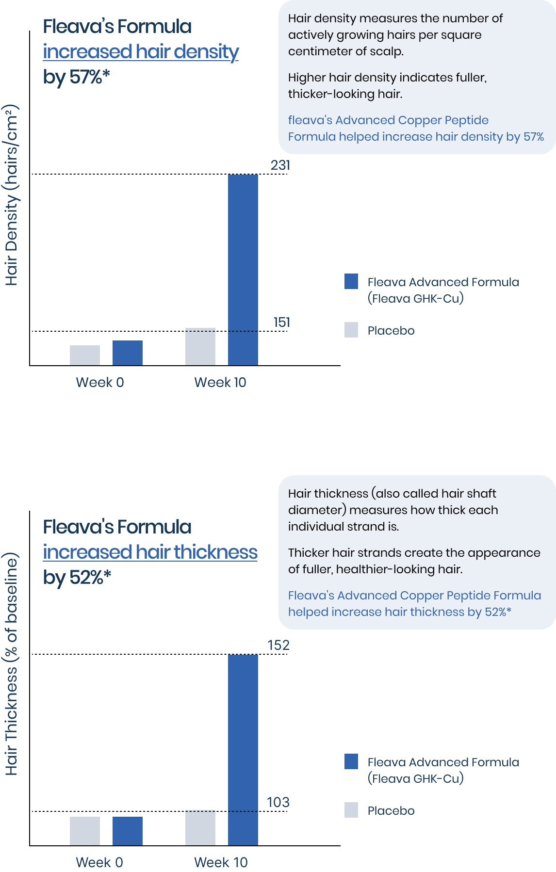 In a double-blind, placebo-controlled clinical study, fleava's Advanced Copper Peptide Formula increased hair density and thickness when applied daily*